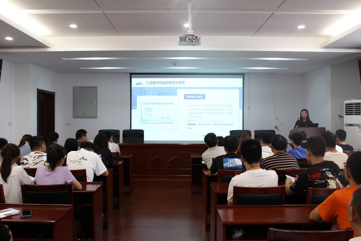 活动分为上午和下午两场。上午为实验室安全教育讲座,由实验室管理员魏丹老师从“实验室简介、仪器的申请与使用、废物处理、事故应急与处理”等四个方面进行讲解。开展实验是每位研究生必经的一步,魏丹老师的讲解使得研一新生们对实验室仪器、材料等的申请使用流程以及事故应急处理措施有了一个细致的了解,引导同学们实验安全化、规范化。