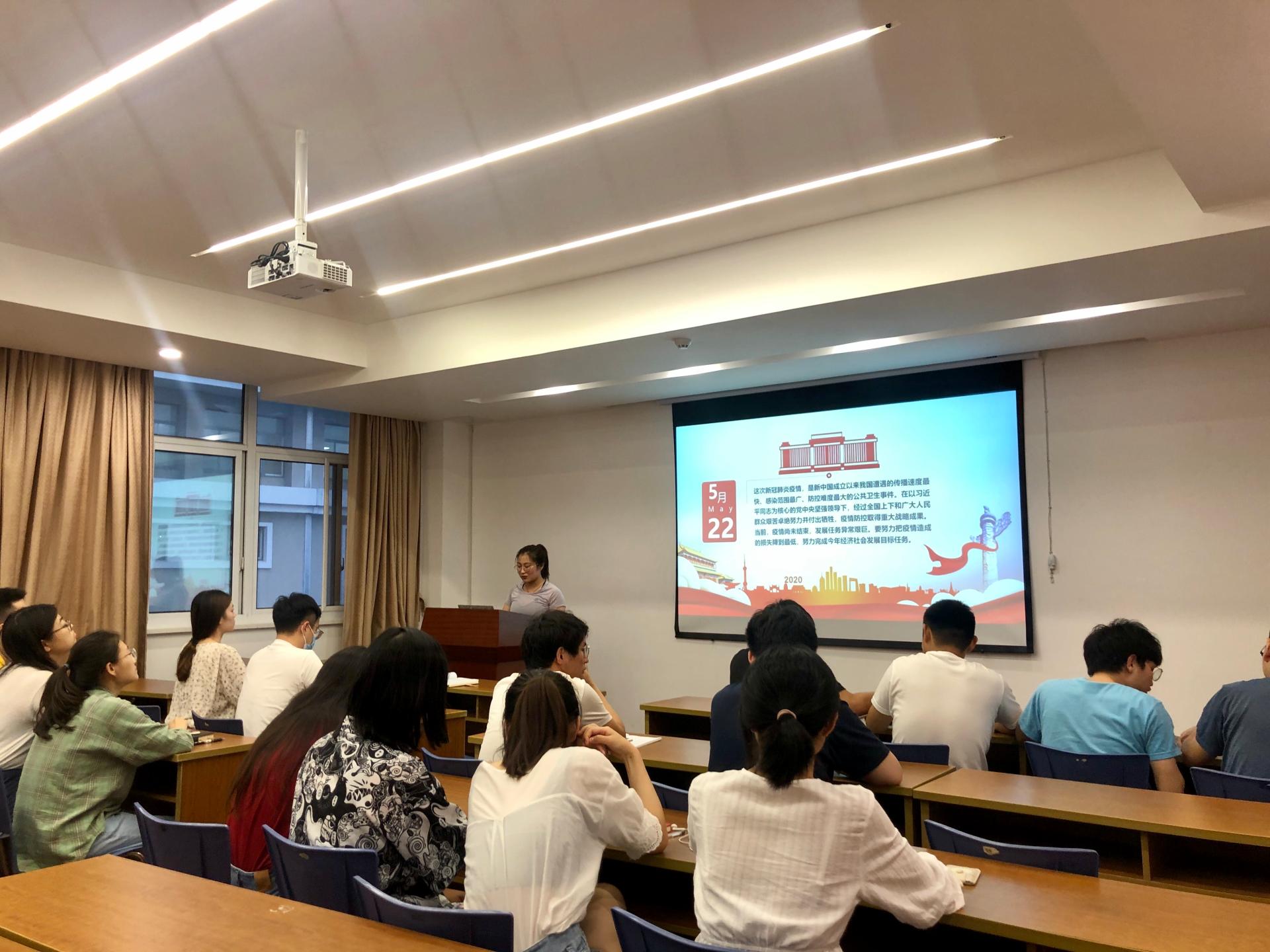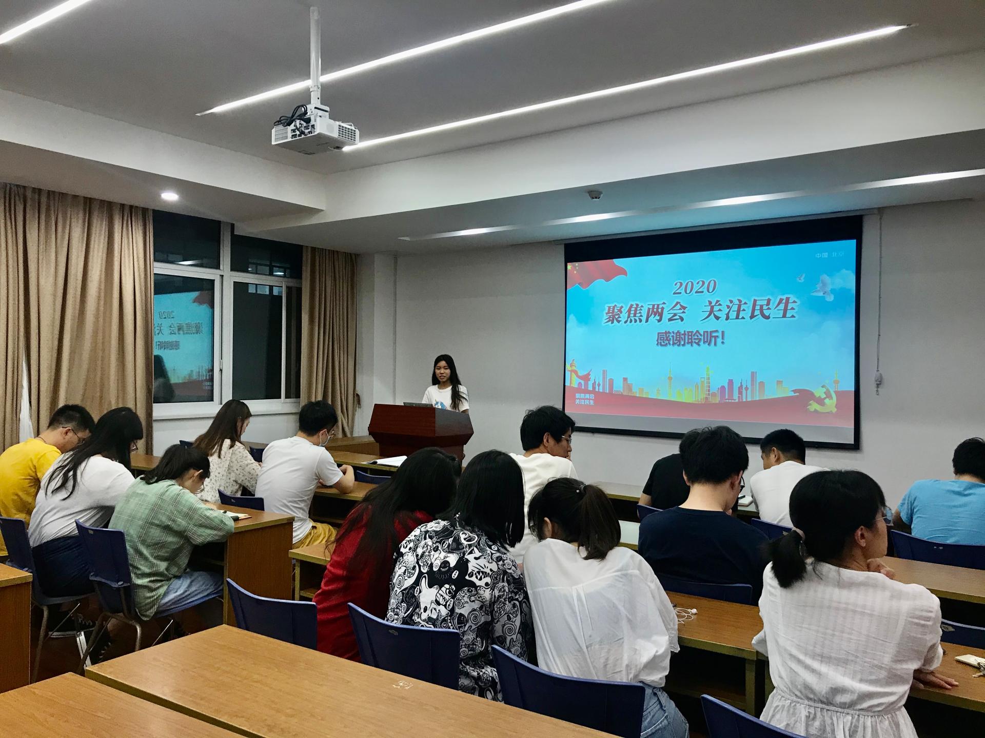 本次活动由集中学习和交流学习两部分内容组成。活动前期,支委会规划了活动实施计划,在此基础上,联系本支部实际,要求支部党员在会前认真观看、了解和摘录会议内容,搜集资料,进行分析学习。集中学习阶段,支部书记吴培红同学以“聚焦两会,关注民生”为主题,围绕“2019年和今年以来工作回顾”、“今年发展主要目标和下一阶段工作总体部署”等具体内容作了深度的讲解,支部党员认真倾听学习。交流讨论时,各支部党员就两会上关注的热点问题畅所欲言、各抒己见。许潇丹同学认为,“人民至上”是我们党永恒变的执政理念,也是广大党员干部的忠实信仰。疫情期间,中国政府重视每一位中国人民,疫情排查到家家户户,对于有困难、不方便的家庭,国家全额补贴,人人平等,让每一位群众的生命安全都能得到保障。王仓天同学就民法典的诞生表示,民法问题本质上就是民生问题,民法典对此前长期存在的社会“痼疾”加以治理,更对未来生活中的问题作出回应。一言以蔽之,民法典将为所有在新时代中怀揣梦想、矢志拼搏的人们提供最坚强的法治保障。当聊到“地摊经济”与就业问题时,张晗同学认为,“地摊经济”看似微不足道,但却发挥着打通城市生活“毛细血管”的作用,激活就业力量的同时满足群众生活需要,不仅赢得了广泛好评,也让广大百姓看到政府解决就业问题的决心和魄力。