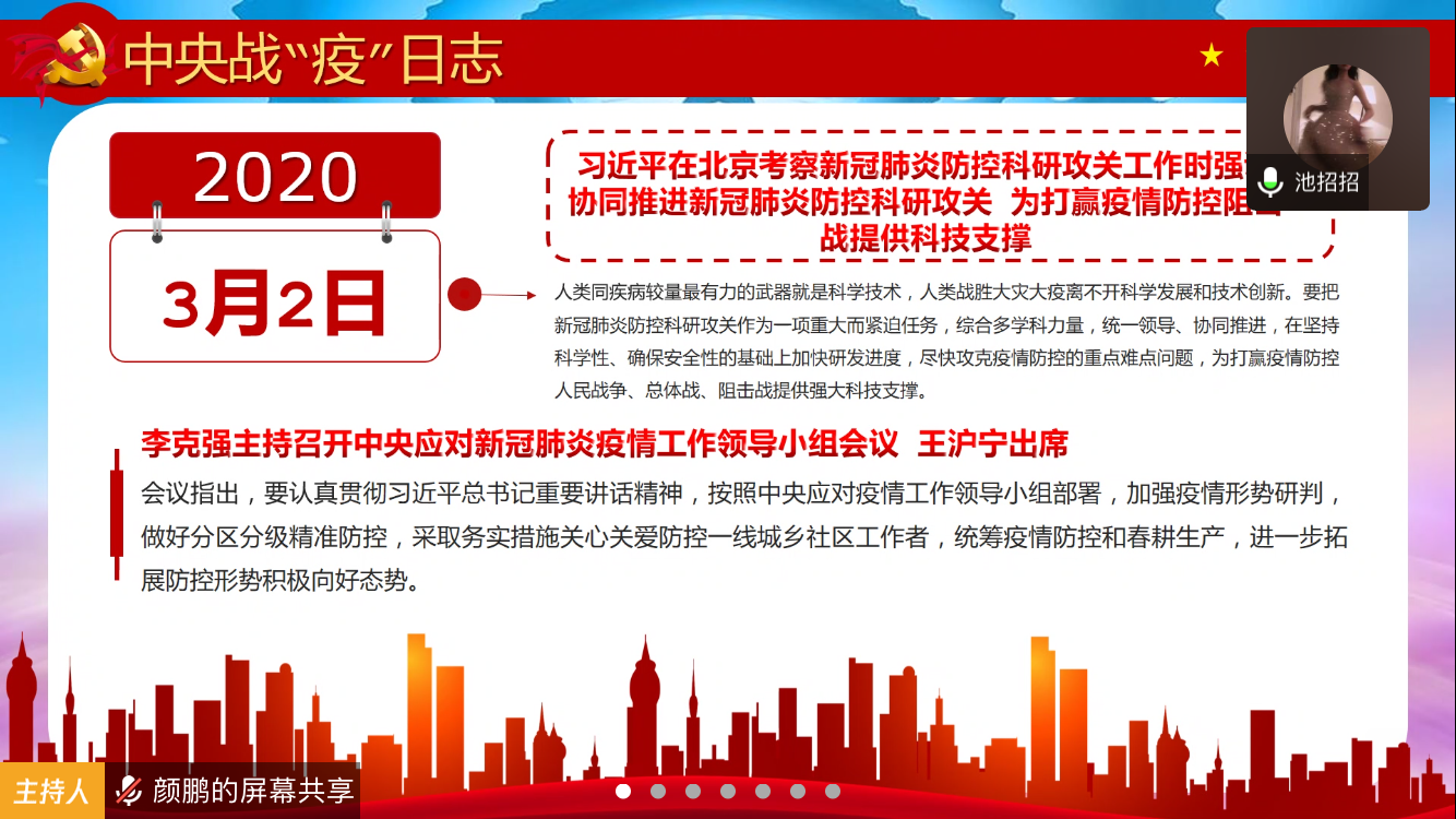 会上,支部党员共同学习了习近平总书记在统筹推进新冠肺炎疫情防控和经济社会发展工作部署会议上的重要讲话要求。支委王季鹏介绍了此次疫情防控工作中的中央战“疫”日志,使全体党员更加深刻意识到中国共产党人心系人民的责任担当。面对严峻考验,在以习近平同志为核心的党中央坚强领导下,中国人民团结奋战、同舟共济,用中国力量、中国精神、中国效率赢得了世界的普遍认同与赞赏。与此同时,支部书记颜鹏提出,全体党员应利用学习强国APP加强线上自学,并在会后要进一步深入学习习近平总书记《在中央政治局常委会会议研究应对新型冠状病毒肺炎疫情工作时的讲话》,从而不断提高对疫情防控工作的认识,切实发挥党员先锋模范作用,带头做好疫情防控工作。