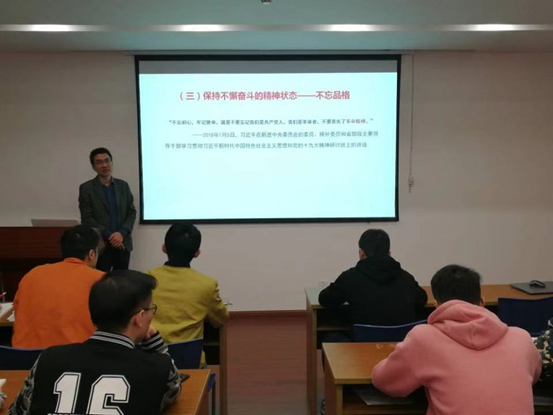 首先,潘勇老师围绕“中国共产党人的初心和使命的由来”、“不忘初心 牢记使命”的深刻内涵”等三个方面,讲述了中国共产党人初心和使命提出的历史背景、伟大意义以及如何在新时代践行初心和使命,并分享了悟初心、担使命的感悟。他强调全体党员要以主题教育为契机,准确把握“为中国人民谋幸福,为中华民族谋复兴”的初心和使命,不断锤炼党性,杜绝不正之风,为社会和学校多提供正能量。