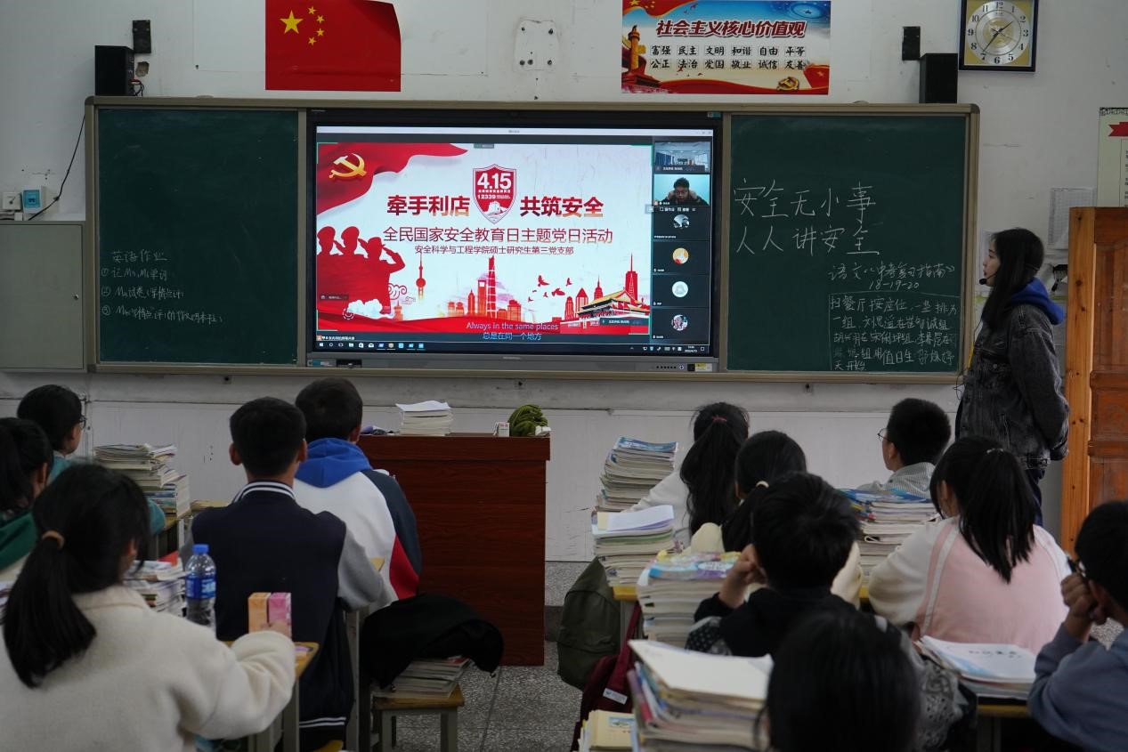 4月15日下午,在第七个“全民国家安全教育日”来临之际,太阳集团tyc86硕士研究生第三党支部围绕主题“树牢总体国家安全观,感悟新时代国家安全成就,为迎接党的二十大胜利召开营造良好氛围”,联动校研支团,面向四川省沐川县利店中学线上开展“牵手利店,共筑安全”主题党日活动。党支部全体党员、校研支团成员阿伦塔娜、赵星宇以及九年级三班全体同学参加活动,活动由党支部书记张兆琛主持。