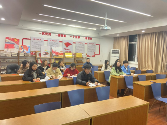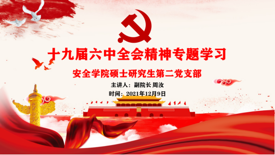 12月9日晚,安全学院副经理周汝在厚德楼411会议室讲授学习十九届六中全会精神专题党课。研究生辅导员钱露、安全学院硕士研究生第二党支部全体党员参加党课培训。