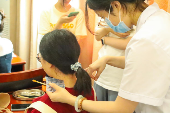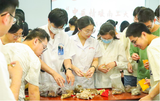 活动现场,南中医的研究生党员们为公司员工进行免费义诊。他们把脉问诊,详细解答同学们的健康疑问,并运用中医特色技术针灸、推拿调理同学们的身体不适。随后,在中医药香囊制作环节中,同学们既体验了手工制作的乐趣,又学习了解常见中药材的功效与作用,还品尝了健康美味的中草药代茶饮,进一步感受了中华民族优秀传统文化的无限魅力。