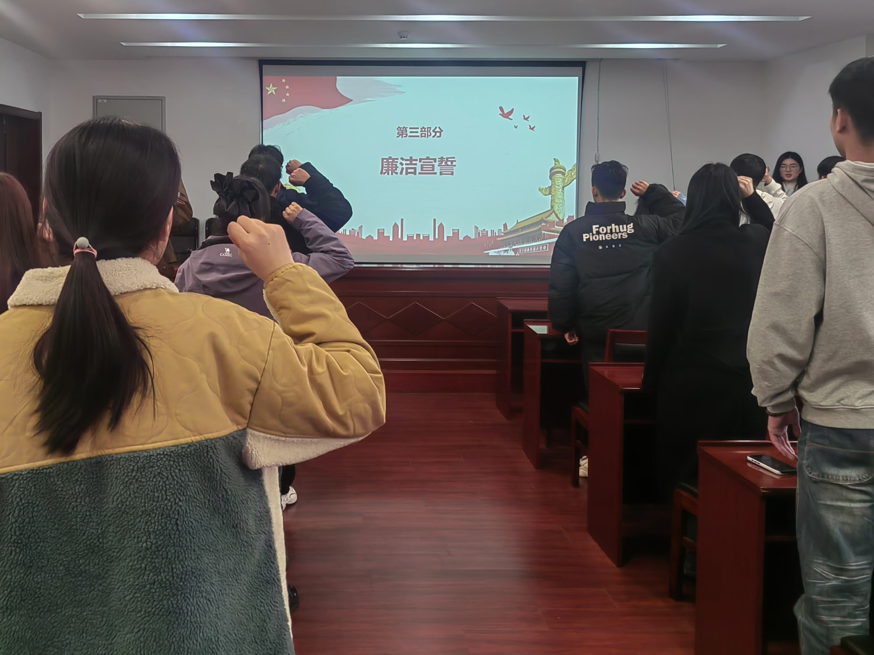 会议伊始,全体党员一同观看了党纪学习教育视频——《加强党的纪律建设是实现全面从严治党的关键》。随后,全体党员签署了《廉洁承诺书》,承诺将保持党员的先进性和纯洁性,为党的事业贡献自己的力量。最后,支部书记王茜老师带领全体党员高举右拳,面对党旗庄严宣誓。铿锵有力的誓言,表达了每一名党员将时刻铭记党员身份,严于律己,清正廉洁的坚定信念。