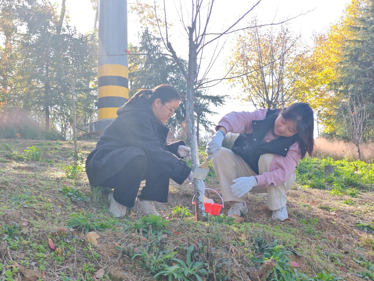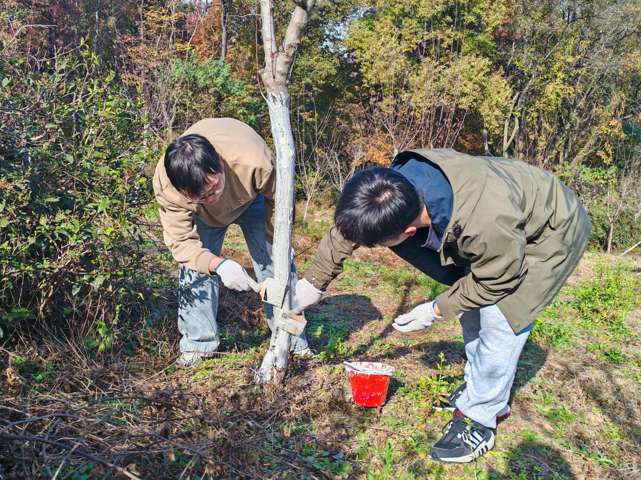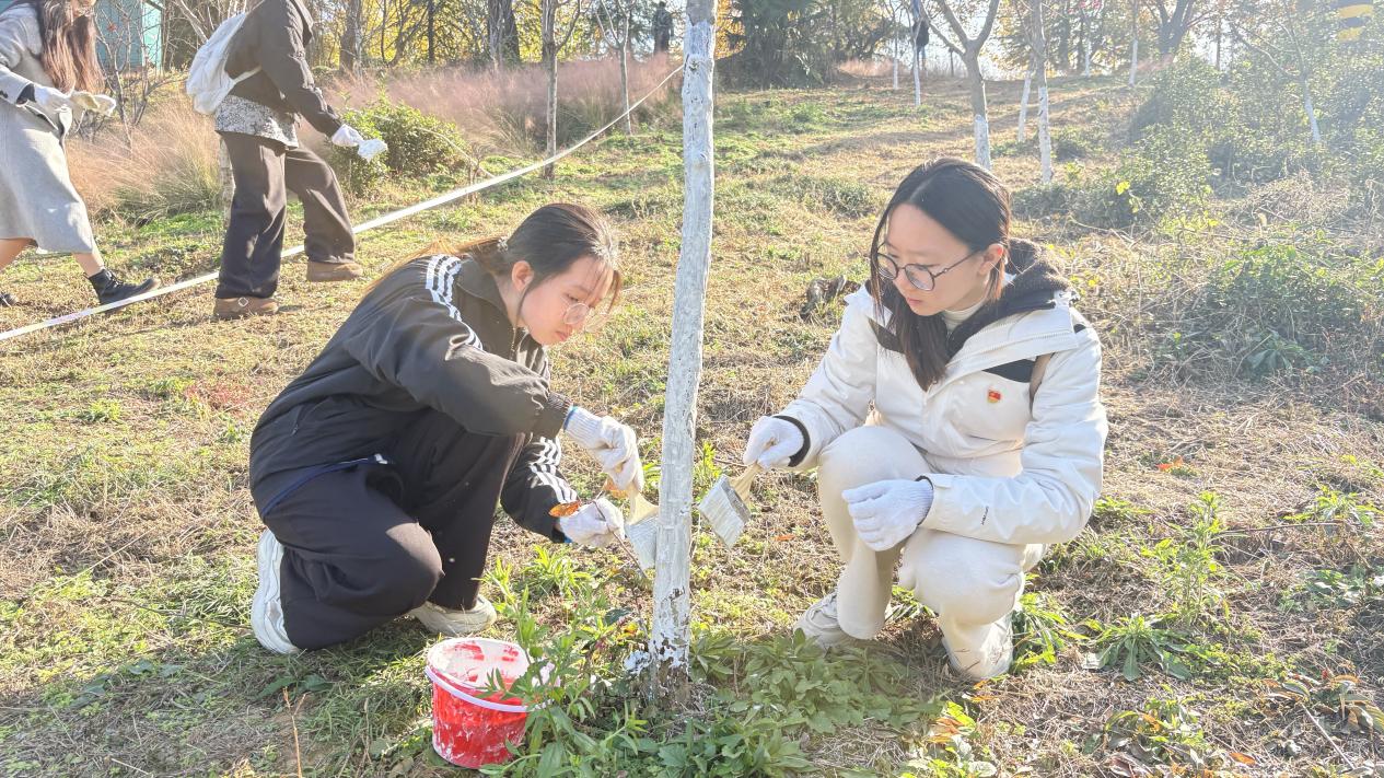 劳动现场,党徽在忙碌的身影间熠熠生辉。师生党员们严格按照刷白技术要求,手持刷桶,细心为每一棵海棠树进行涂白。大家分工协作,或测量高度,或专注涂抹,对树皮的缝隙和孔洞处进行重点刷涂,确保不留死角。