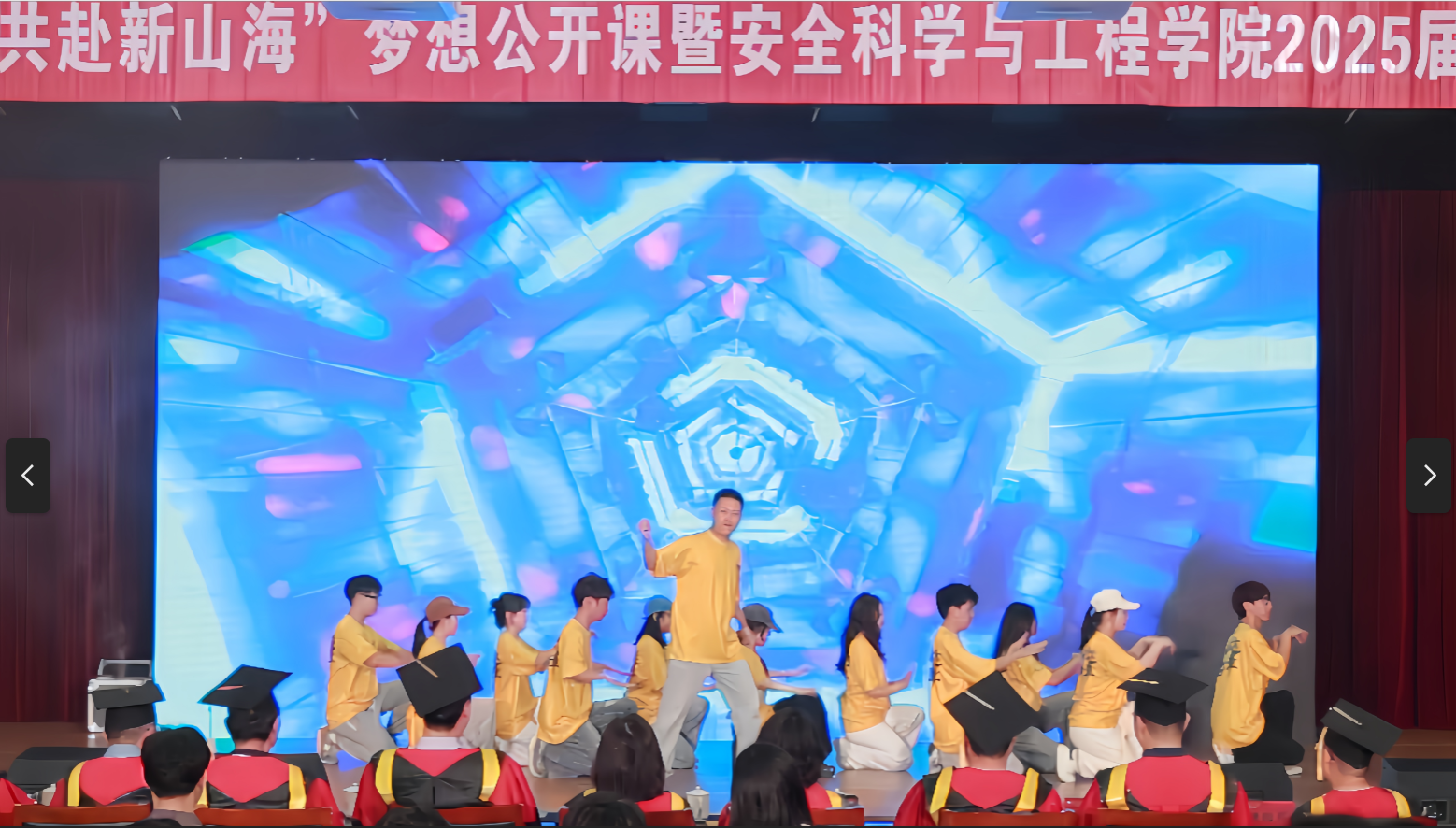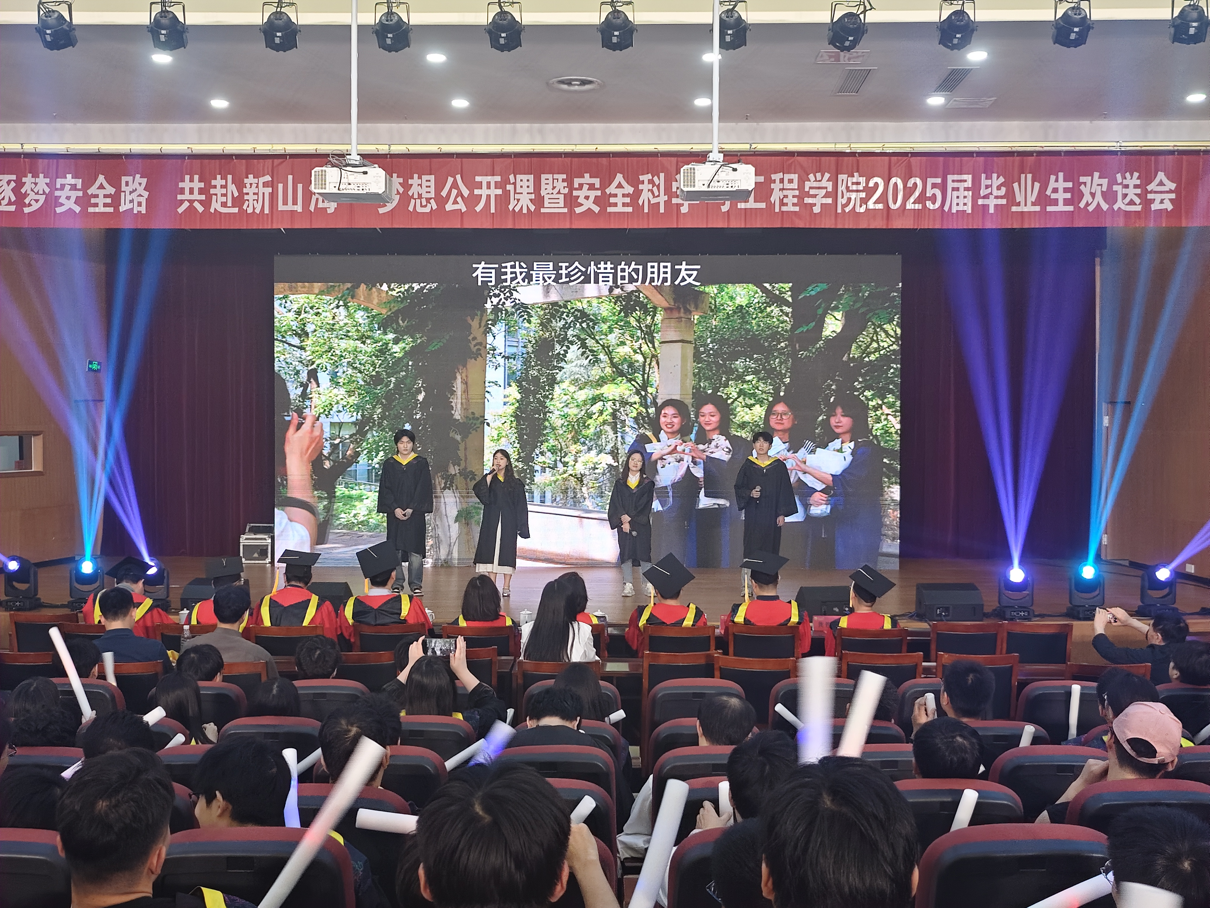 欢送会现场还精心安排了丰富的文艺节目。趣味视频《从你的南工大路过》温情回顾校园点滴,双人脱口秀《安全毕业》以专业视角带来欢笑与思考,充满活力的舞蹈《歌舞青春》展现了毕业生的青春风采。最后,欢送会在全体师生的深情合唱中圆满落幕。