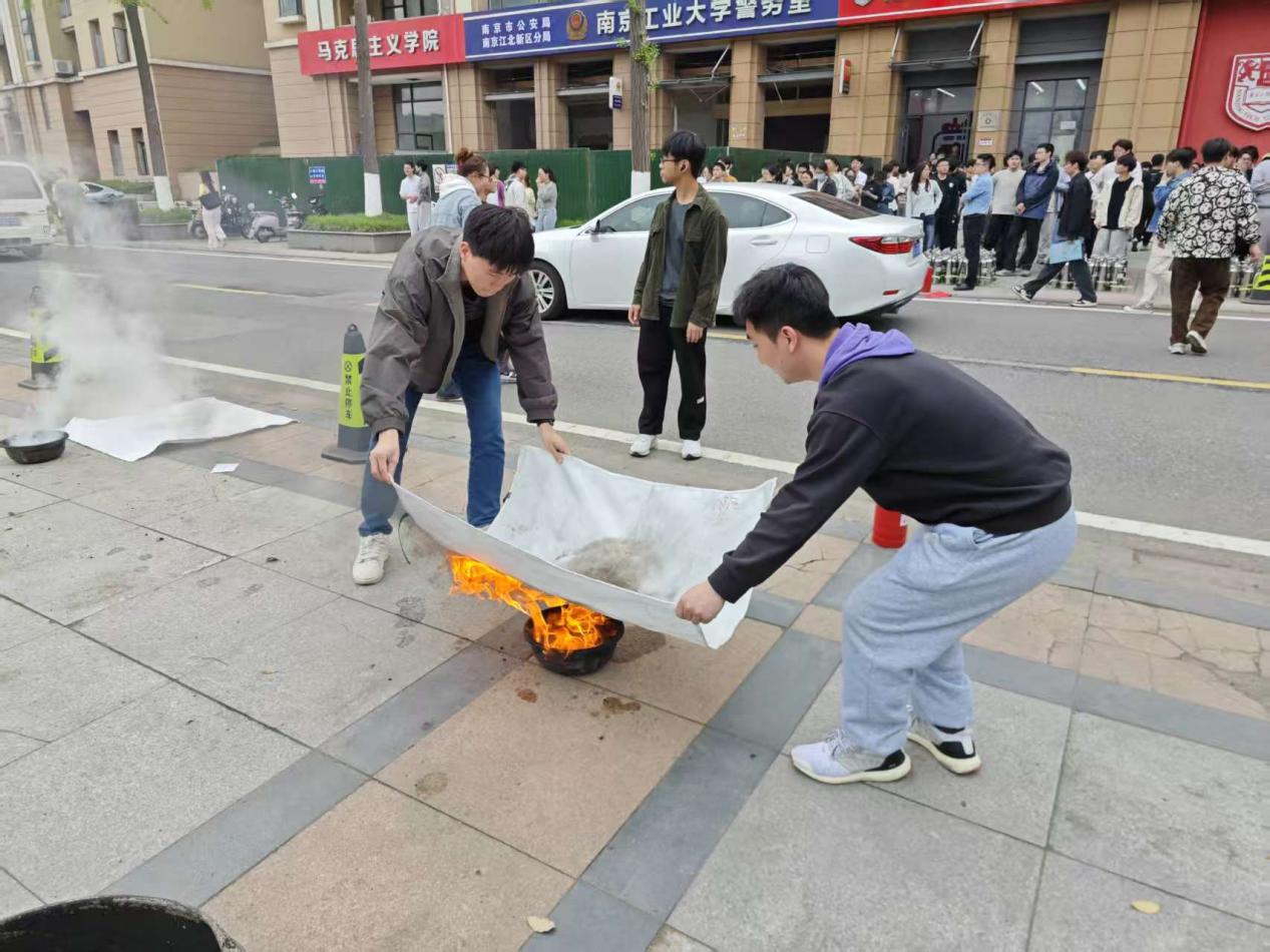 随后,保卫处张望老师进行现场示范教学,围绕灭火毯、灭火器及消防防毒面具的操作要点与注意事项,逐一进行详细讲解和规范演示。全体参演人员分组开展灭火毯、灭火器实操练习,保卫处工作人员全程指导,及时纠正不规范动作,确保每位参与者熟练掌握应急操作技能。