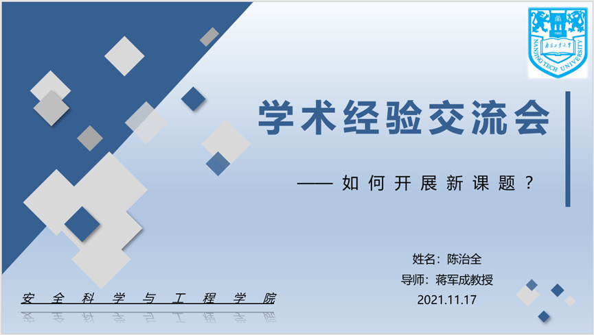 王宏涛博士首先与大家分享关于三元有机太阳能电池的研究;陈治全博士就“如何开展新课题”与大家分享心得体会,提出选题要充分考虑需要性、创造性、科学性、可行性原则;颜廷欧博士就学术研究和项目工作进行交流。最后,两位博士新生齐英全和白伟针对粉尘/瓦斯复合爆炸特性参数研究和文献阅读及论文写作心得等方面展开分享。