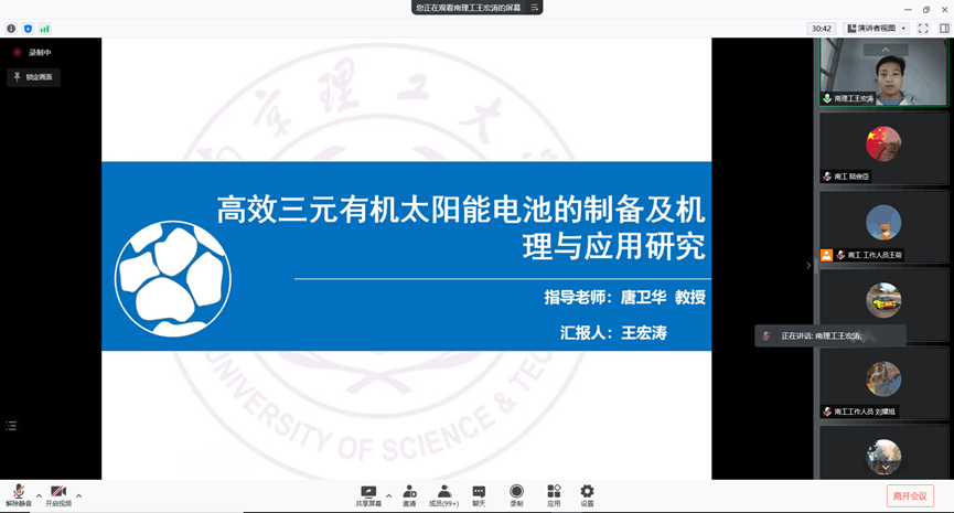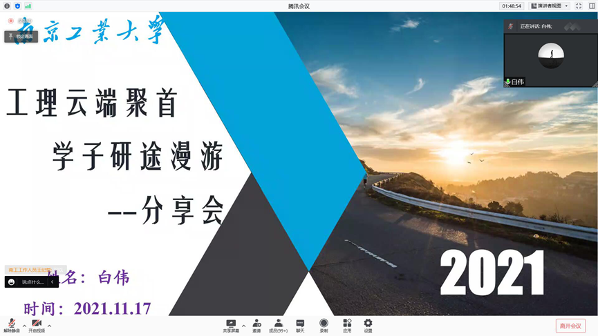 11月17日下午,太阳集团tyc86与南京理工大学化学与化工学院联合举办“工理云端聚首,学子研途漫游”线上学术交流活动。本次活动邀请了太阳集团tyc86的三位博士生陈治全、白伟、齐英全以及南京理工大学化学与化工学院的两位博士生王宏涛和颜廷欧,讲述自己的科研经历,传递精益求精、追求卓越的科研精神。本次活动共有200名员工参加,活动由王荷同学主持。