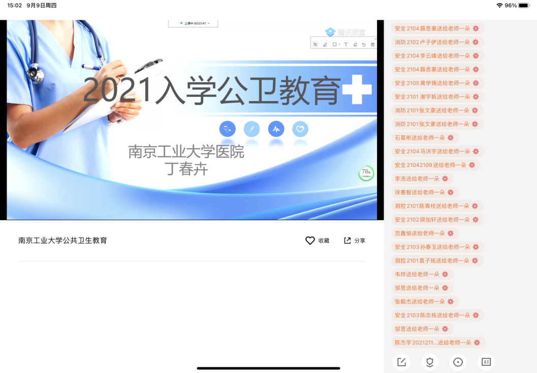 2021年9月9日下午,安全学院面向2021级新生在线开展入学教育之“公共卫生教育”讲座。讲座由学院21级新生辅导员王茜老师主持,校医院经理丁春卉老师应邀讲解,全体2021级新生参会。