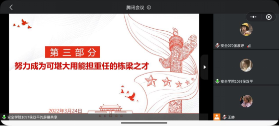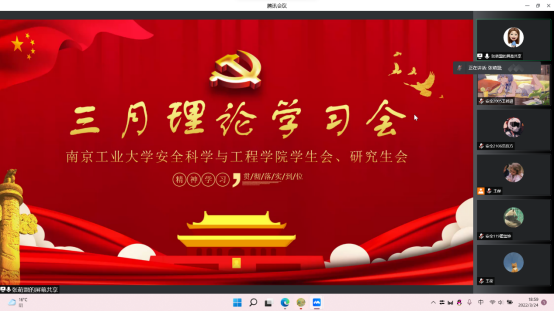 为强化员工思想理论建设,坚持动态学、专题学,3月24日晚,安全学院员工会、研究生会通过线上形式召开三月政治理论学习会。本次会议由张萌盟主持,院员工组织成员集体参加。