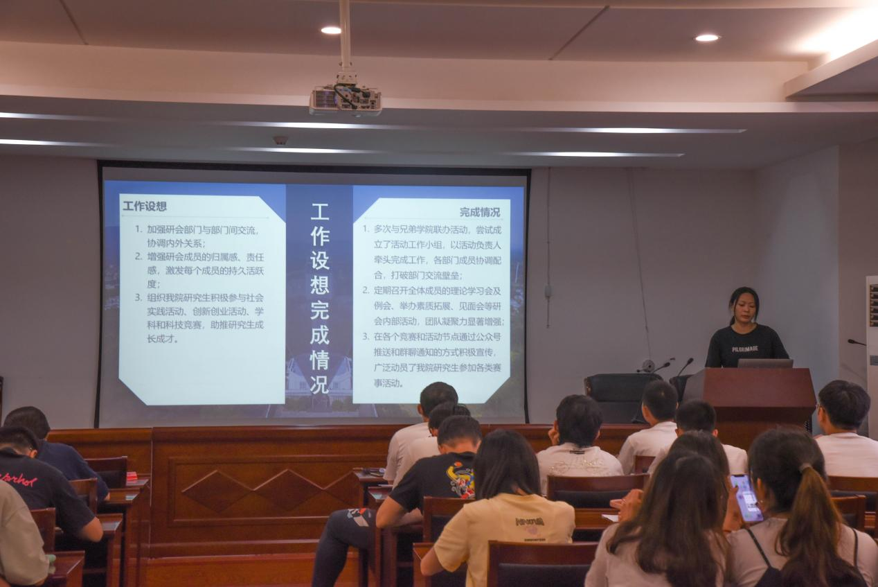 会上,院研究生会主席团成员及各部门负责人依次就本学期工作内容、个人情况、成果展示及工作规划四个方面作出述职报告。评议人员现场提问,并根据答辩情况,结合个人所在团支部鉴定意见进行综合评议。