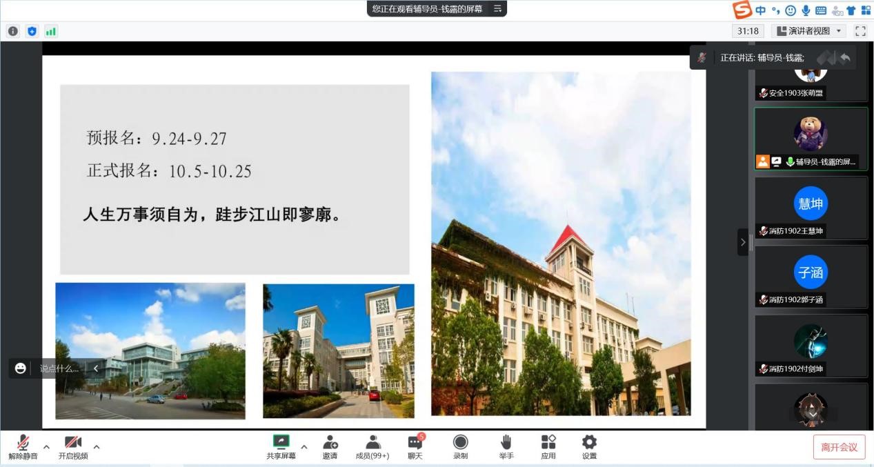 会上,钱露老师依次从日常教育管理、安全教育、就业、升学等四个方面讲述注意事项。教育管理方面,钱露老师强调,毕业班员工须认真落实学分核对自查,严格落实校园疫情防控要求;安全教育方面,教育引导同学们严格遵守宿舍卫生和安全相关规章制度,切实维护校园安全稳定局面;最后,钱露老师以近三年毕业生就业和升学去向为例,对于就业政策、行业发展、签约程序、考研择校向毕业生做详细解读与分享,鼓励同学们抓住秋招“黄金期”,勉励备考学子明确目标、精准定位。