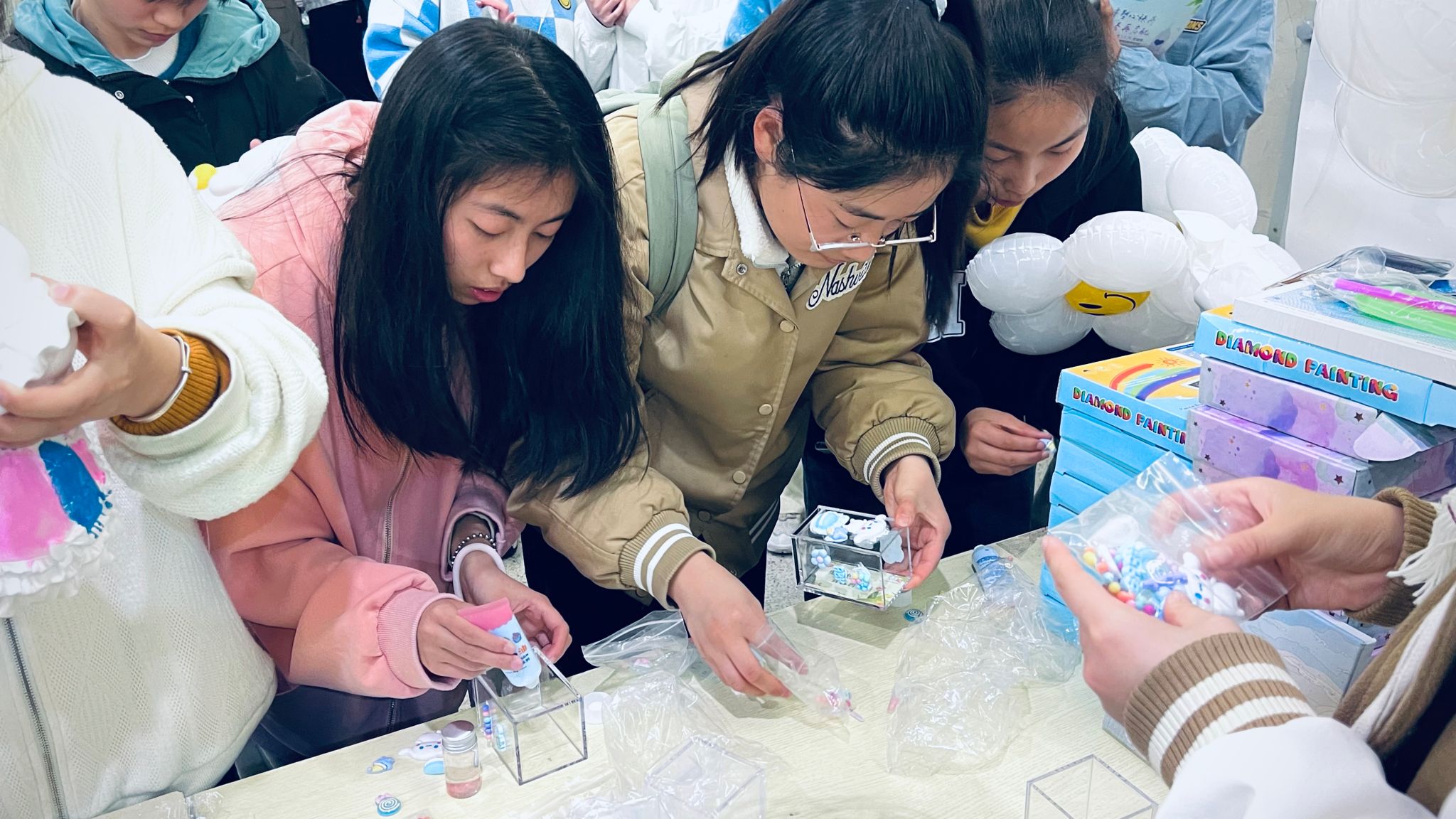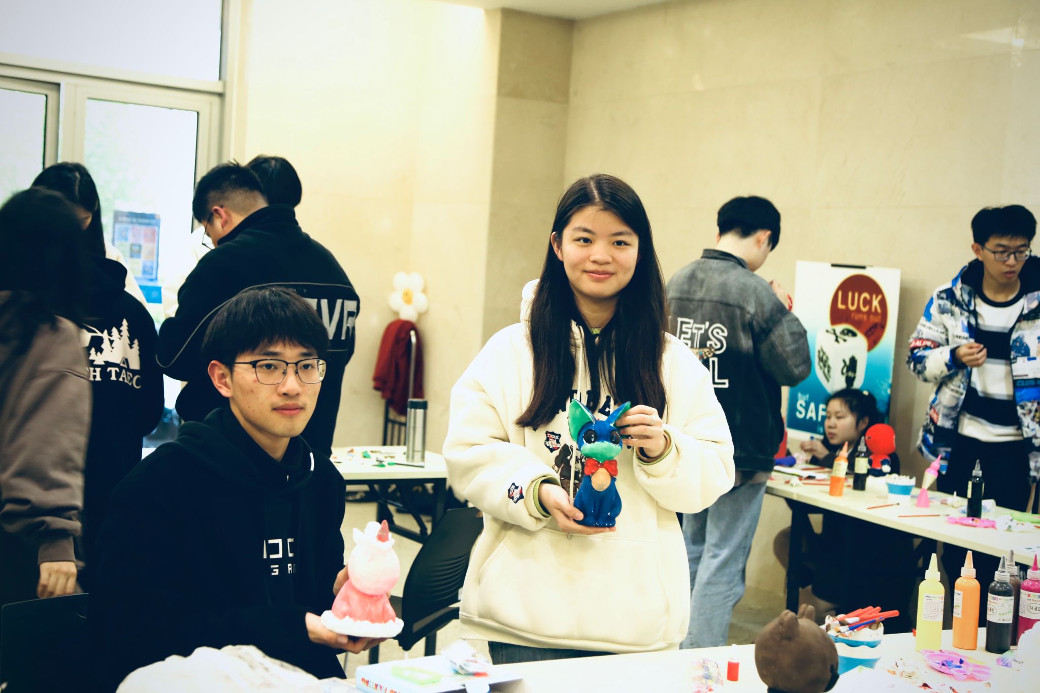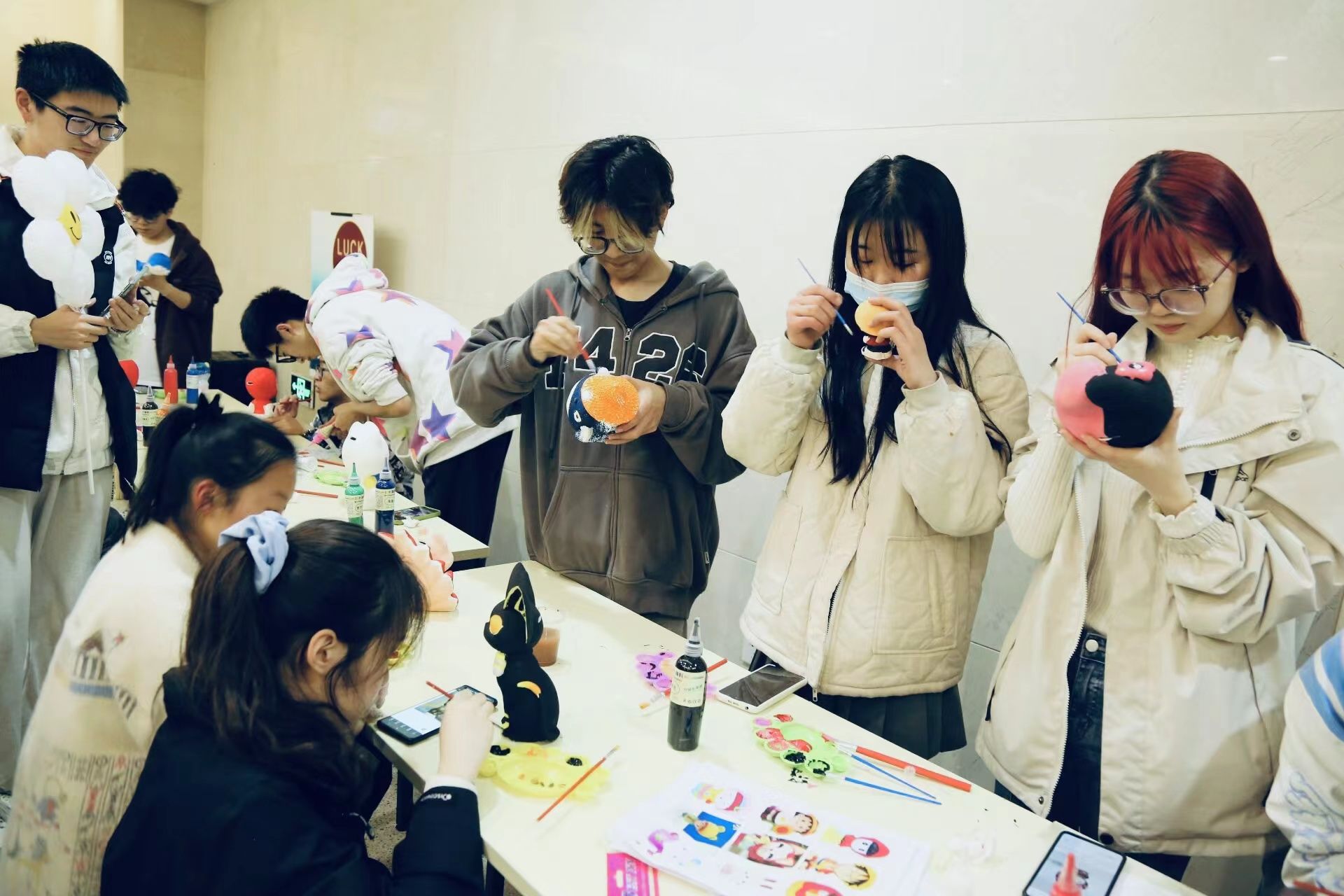 本次活动设置涂鸦石膏娃娃、制作笑脸气球、手工DIY笔筒、创作数字油画等环节,同学们手绘涂鸦、自我创作,用画笔绘出青春,用创意点亮生活。