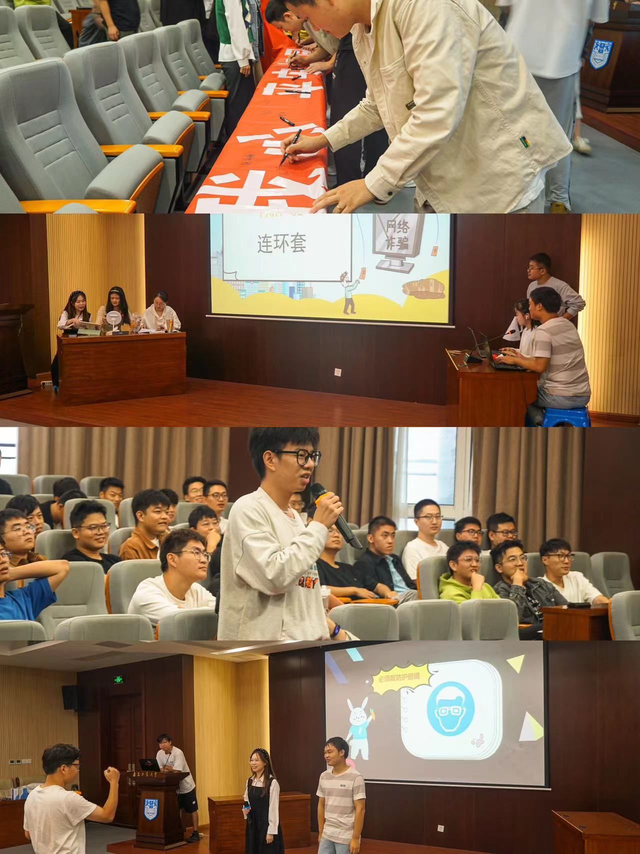 本次主题班会包括专题讲话、新生安全培训、签字仪式、案例分享、情景剧表演以及趣味小游戏等六个环节。
