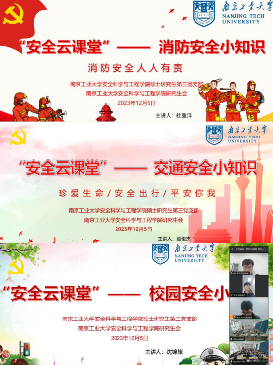 首先,学院硕士研究生第三党支部副书记杜重洋向同学们介绍了本次活动的意义,围绕火灾的主要特性、应急处理以及灭火器材的种类、使用方法等方面进行消防安全知识普及教育。随后,院研究生会成员顾俊杰、沈锦旗分别围绕交通安全、校园安全两个方面进行安全教育,并根据校园中的实际情况组织同学们进行安全知识抢答,同学们热情积极、踊跃抢答,将整个课堂气氛推向高潮。最后,校第25届研支团四川分团成员、安全学院2023届本科毕业生张萌盟同学对本次“安全云课堂”活动进行了总结,并再次警示同学们提升安全意识,平安顺利地学习与生活。