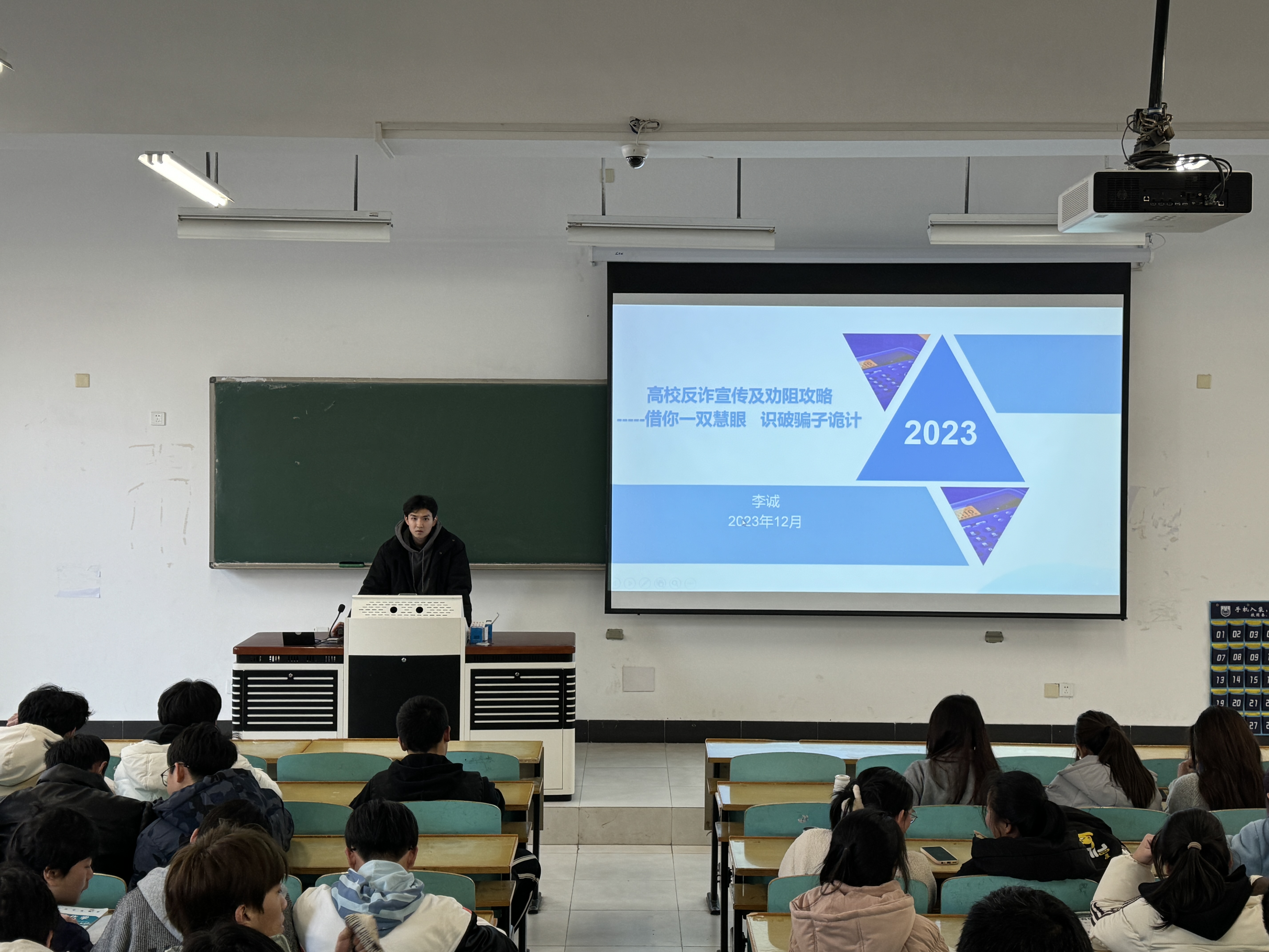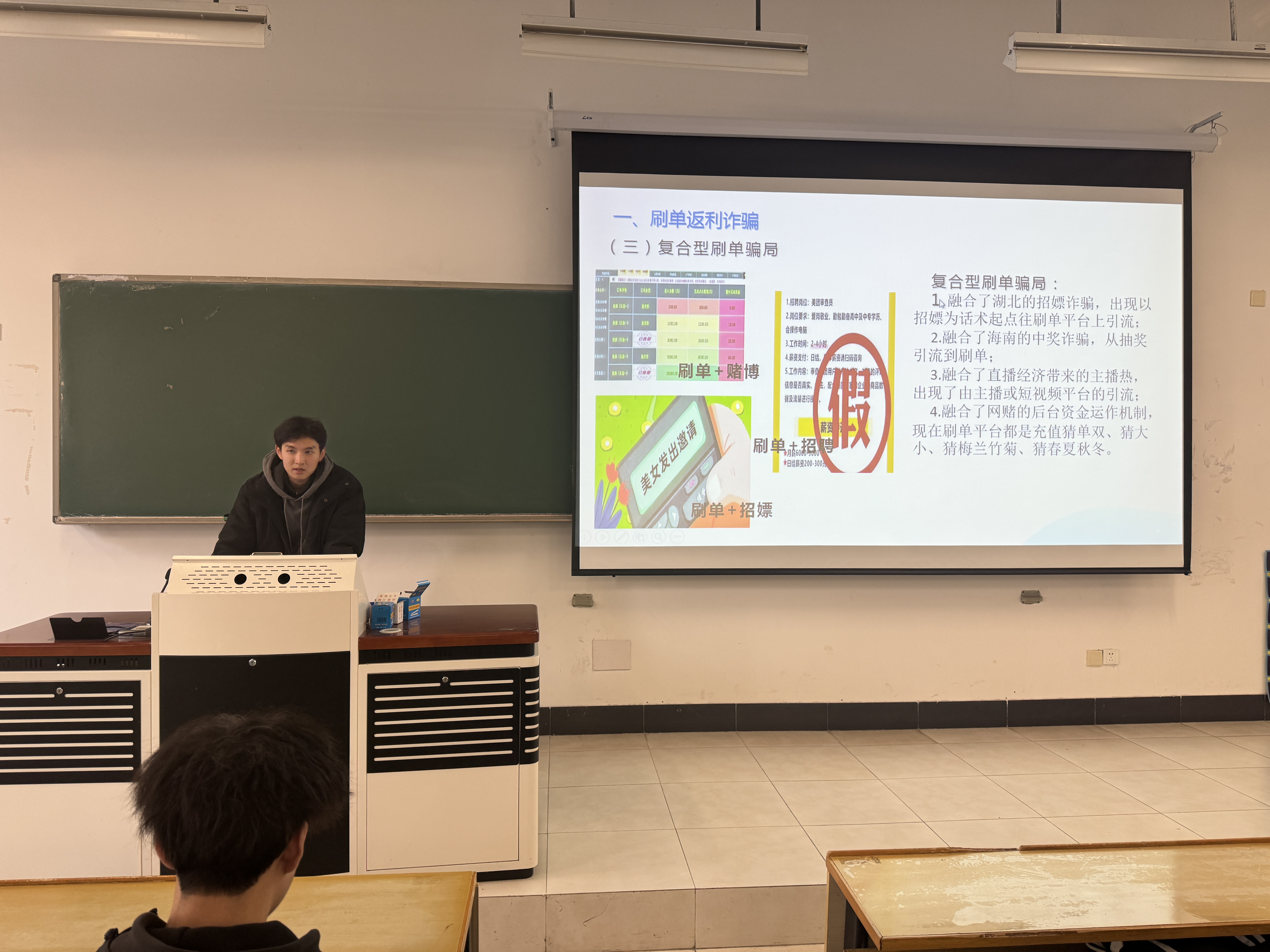 会议伊始,李诚老师用校园案例引入反电诈主题,分析当前电信网络诈骗形势,特点以及作为当代老员工该如何应对。其次,通过典型案例,介绍诈骗套路手法和预防补救措施,详细介绍了刷单返利、虚假网络投资理财、冒充电商物流客服、虚假贷款、虚假征信、虚假购物服务、冒充领导熟人等特定身份、网络游戏产品虚假交易、冒充公检发及政府机关,裸聊这十种高发的网络诈骗类型。最后,李老师讲述了反诈中心开展电信网络诈骗预警劝阻的方式方法,提醒同学们要重视电信网络诈骗,不能掉以轻心。