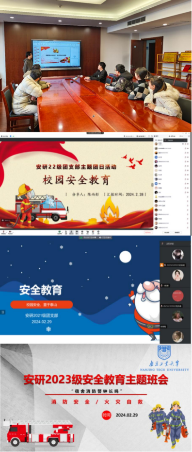 2024年2月29日,安研2021级团支部线上开展了“校园安全教育”主题团日活动。主持人刘佳妮就消防安全和预防电信诈骗两个方面进行了宣传教育,并组织同学们观看了校园安全警示片,从宿舍安全、食堂安全、实验室安全等各个方面引导同学们时刻牢记“安全至上,生命第一”的理念,强化自我防范意识,筑牢安全防线。同日,安研2023级团支部线上开展了“宿舍消防安全教育”主题团日活动。活动由主持人介绍南京“2.23火灾”事件开始,提醒同学们作为宿舍的主体,应该高度重视宿舍消防安全。随后,主持人带领同学们观看了宿舍消防安全相关视频,从各方面予以警示,并科普注意事项。最后,通过介绍排除火灾隐患与火灾自救措施,让同学们掌握预防火灾的安全知识。
