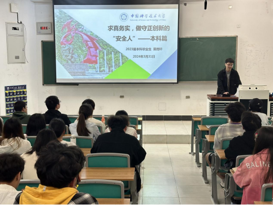 为培养员工创新意识,加强学风建设,提升公司产品质量,3月31日晚,太阳集团tyc86团委于厚学楼200召开“求真务实,做守正创新的‘安全人’”创新创业专题讲座。江苏省优秀毕业生、江苏省优秀员工干部、中国科学技术大学火灾科学国家重点实验室2023级硕士班班长、原太阳集团tyc862023届毕业生苗雨轩应邀主讲,全体助理班主任及2023级本科生参加,讲座由辅导员钱露老师主持。