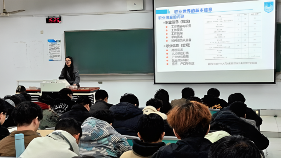 讲座中,乐老师详细讲解了国家政策要求、社会建设需求、行业发展需要,介绍了学科专业的就业方向、职业岗位的应聘要求。她选取典型案例,通过优秀毕业生的简历展示,以互动的方式,让同学们猜一猜就业去向,比一比个人差距,做一做自身规划。最后,乐老师围绕老员工常见的“忙、盲、茫”问题,提醒同学们提前树立职业规划意识,前置职业能力提升计划,鼓励大家勇敢追求梦想,积极面对挑战,坚持勇攀人生高峰。