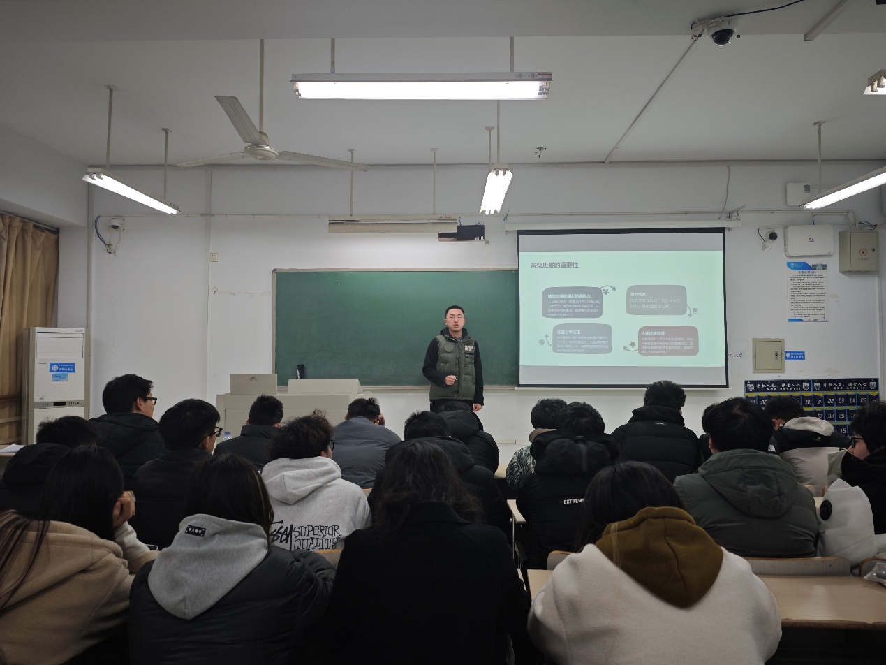 本次班会分为班委述职、建设计划、总结激励三大模块。各班委成员以“勤恳务实、锐意创新”为主题就负责板块进行述职。班长殷越旻同学对上学期班级建设情况进行了总结,就新学期班级思想、学业、生活“三维提升工程”建设计划进行了详细讲解。最后,助理班主任孙春杰同学勉励全体同学要树立“立鸿鹄志、做实干家”的精神,在专业学习中深耕细作,在实践行动中彰显担当。