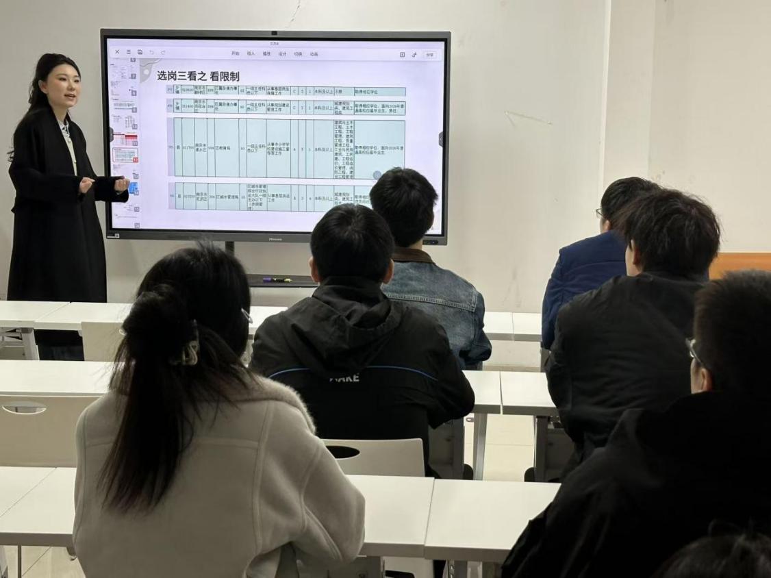 周世婕首先梳理了“江苏人事考试网”等官方报考核心渠道,明确关键时间节点。针对选岗难题,她结合实例,讲解了“看层级、看地域、看限制”的科学方法,强调应充分利用自身条件锁定优势岗位。在备考策略上,她系统分析了行政职业能力测验与申论各模块的重点,并分享了面试实用技巧。互动环节,周世婕围绕“当下人工智能盛行,有人认为这增加了人类的可替代性,会导致大规模失业。你怎么看?”等典型面试题目,现场组织模拟面试,引导同学们从技术变革与社会治理、公共政策调节、人才结构转型等多角度剖析问题,并结合公共部门工作实际进行实战演练。分享会聚焦实战,内容系统全面,现场讨论深入、气氛热烈。