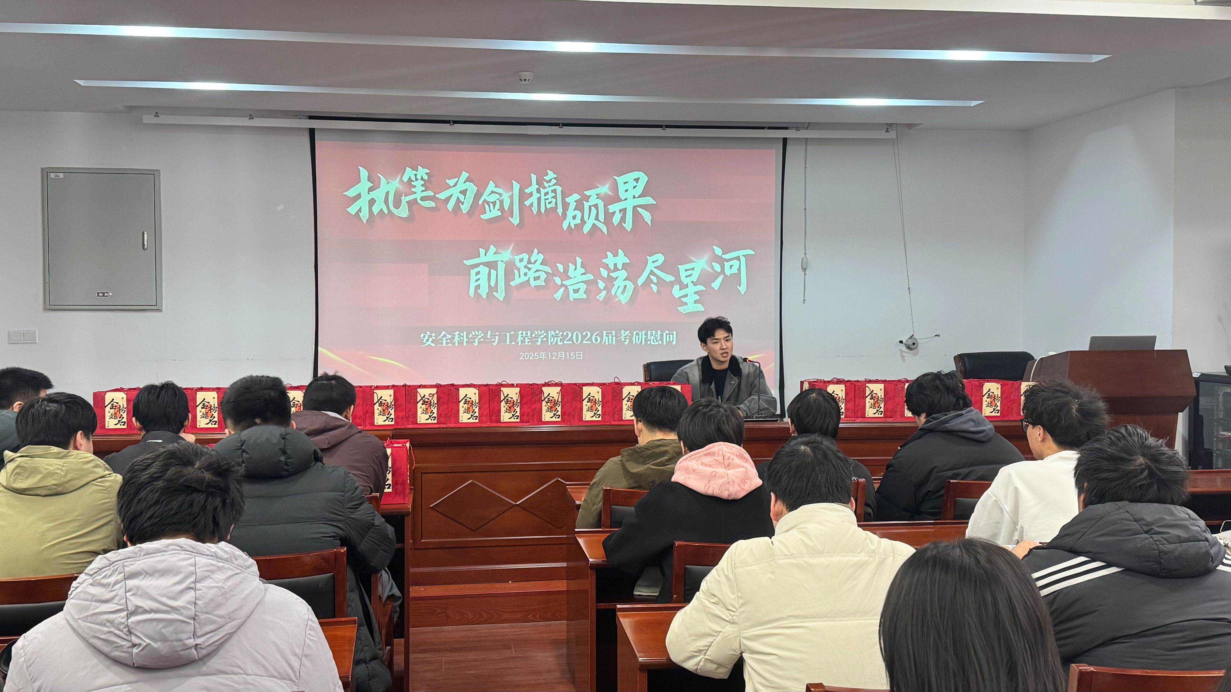 活动中,李诚老师代表学院向正在冲刺阶段的同学们表达了关怀与支持。他结合往年考研情况与当前备考阶段特点,叮嘱同学们在最后关头要稳住节奏、查缺补漏,注重学习方法与效率,同时也要关注身心状态,以平稳、自信的姿态迎接考试。他勉励大家保持定力,将长期积累的知识与能力化为考场上的从容发挥,执笔为剑,为自己的奋斗征程交上圆满答卷。随后,学院志愿者为备战考研的同学们送上了精心准备的“考研加油包”,每一份礼物都承载着学院对学子们金榜题名、前程似锦的诚挚祝福。