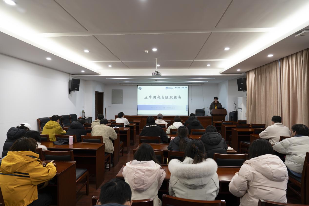 会上,院研究生会主席团成员及各部门负责人依次就本学期工作进展、个人工作情况、部门内任务交接等事项作述职汇报,并根据评议人员的提问进行答辩。